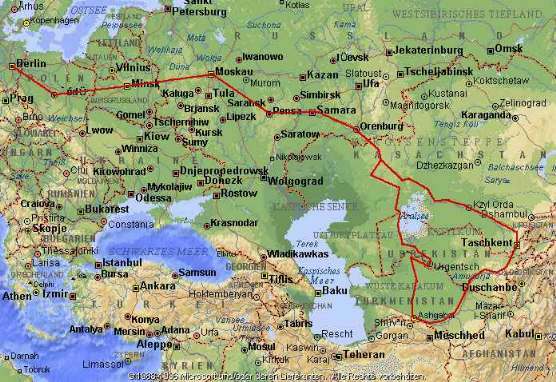 Wie schnell festzustellen war, gehörte die nördlich vom Iran gelegene selbständige Republik Turkmenistan zur ehemaligen Sowjetunion. Somit war zumindest dieses Problem geklärt und die erste Neugierde geweckt. Auch die anderen Fragen waren schnell geklärt. Turkmenistan deshalb, weil es zu 90% aus Wüste besteht! Die Reiseroute war schnell festgelegt. Anreise über Russland, dann in den Norden von Kasachstan und dann irgendwie zwischen dem Kaspischen Meer und dem Aralsee nach Süden in Richtung Aschrabat ...