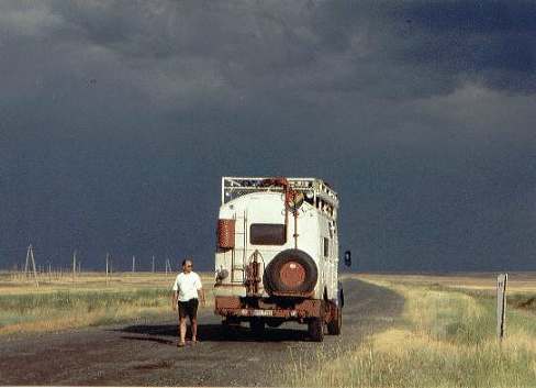 Samara, die Stadt an der Wolga, erreichten wir nach zwei weiteren Tagen Fahrt. Die Strecke bis dorthin war nicht besonders anstrengend, dennoch verabschiedete sich unterwegs ein wichtiges Kupplungsteil von einem der Fahrzeuge, so dass wir auf Hilfe angewiesen waren. Hierbei konnten wir zum ersten Mal nicht nur die ausgesprochene Gastfreundlichkeit erfahren, sondern auch das einmalige Improvisationstalent der Russen. Es musste ein Kugelkopfgelenk am Kupplungsgestänge erneuert werden. Kurzerhand fragten wir bei den städtischen Busbetrieben Penza nach und dort wurde ohne große Probleme mit einem Stück Metall und der entsprechenden Fähigkeit im Schweißen das Kugelgelenk erneuert. Dem Charme von Samara und der Wolga konnten wir uns nicht lange hingeben, da ja immer noch ca. 1.000 km bis zur kasachischen Steppe vor uns lagen. Also weiter, auf nun zunehmend schlechter werdender Strecke nach Orenburg und zur kasachischen Grenze ...
