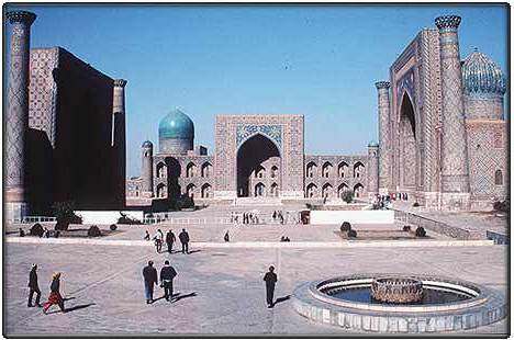 Samarkand sollte unsere letzte gemeinsame Station sein. Meine Reisepartner wollen den Rückweg über den Iran antreten, ich muss den kurzen Weg durch Kasachstan und über Moskau wählen. Aber zuvor geht es an unendlichen Baumwollfeldern erst einmal Richtung Samarkand. Bei diesem Namen komme ich immer ins fantasieren. Ich stelle mir eine große Oase mitten in der Wüste vor, eine Perle im Orient. Die Erzählungen von Marco Polo fallen mir dazu ein. Allerdings ist auch hier die Realität ernüchternd. Durch Erdbeben und kommunistischen Kahlschlag sind nur noch die alte Koranschule und einige Moscheen übriggeblieben, der Rest ist moderne Plattenbauweise. Schade und enttäuschend, aber nicht zu ändern.