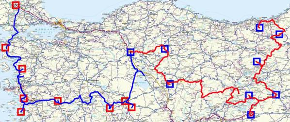 Gegen Ende April 2014 starten Sepp und seine Begleiter also zu ihrer ersten "richtig" großen Tour, über die wir im Folgenden in mehreren Teilen berichten werden. Der erste Teil führt uns entlang der oben blau eingezeichneten Strecke durch die Türkei, der zweite Teil befasst sich mit dem rot eingezeichneten Abschnitt und der dritte und letzte Teil schließlich berichtet über die Georgienrundfahrt zum Abschluss ...