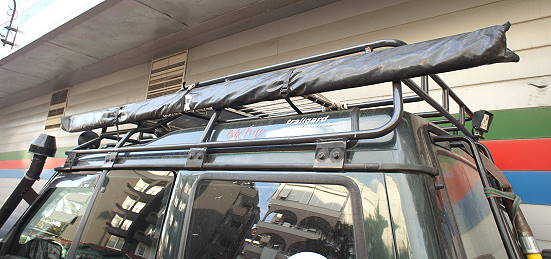 Dann entdecke ich bei ihm in der hintersten Ecke noch eine Markise von Overland: Ich frage Hasan, ob ich die bekommen kann. Da er keinen anderen Interessenten hat, gibt er sie mir. Auch der Preis von 150 Euro ist in Ordnung: Sie ist fast neu, vielleicht ein- oder zweimal gebraucht. Ich schnalle sie direkt auf den Gepäckträger der Zicke.