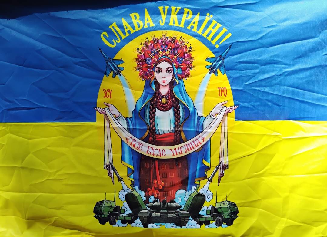 ukrainischen Motivationsparolen anbot. Darunter auch eine Flagge mit dem