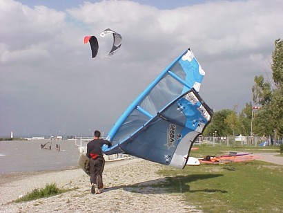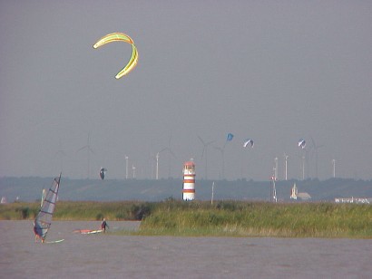 Der Wind frischt auf und auf dem See tummeln sich nun viele Kitesurfer, um ihre teilweise beeindruckenden Kunststückchen vorzuführen. Ein großer Vorteil ist die geringe Wasserhöhe: Wer vom Brett fliegt, muss sich nicht schwimmend wieder auf das Teil zurück hieven, er kann bequem noch einmal aufsteigen. "Normale" Surfer sind hier in der Minderzahl.