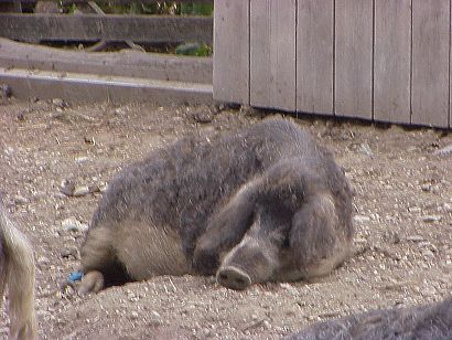 Wir radeln weiter zu einem Gehege mit urigen Wollschweinen, die vor sich dösen. Sie sind die Knallerei und den Kunstflieger offensichtlich gewöhnt.