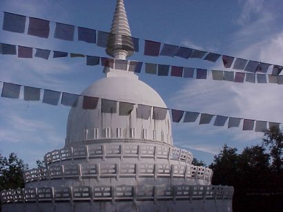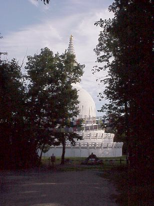 Es ist Mittag und wir wollen die nahe gelegene 30 Meter hohe Stupa besichtigen: Sie ist in Europa das größte buddhistische Grabmal. Die Stupa wurde 1993 vom Dalai Lama eingeweiht. Vom Campingplatz aus sind es ca. 3 km Fußweg, der uns durch teils sumpfigen Wald führt. Leichtsinnig haben wir uns auf den Weg gemacht ohne "Nordic Summer", ohne Autan, denn mit skandinavischen Verhältnissen haben wir hier wirklich nicht gerechnet. Doch schließlich von Mücken gejagt wie einst in skandinavischen Wäldern, schafft man heute die Strecke auf den 316 Meter hohen Berg in Rekordzeit.