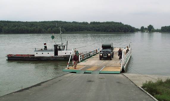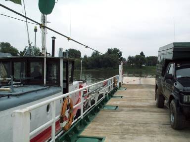 Wir fahren weiter und erreichen nördlich noch eine alternative Fähre bei Gerjen, bei der mit einem Boot eine Plattform für wenige Fahrzeuge über den Strom bugsiert wird. Heute stellen wir hier das einzige Fahrzeug, lediglich zwei kostümierte einheimische Damen begleiten uns über den Fluss, auf dessen gegenüberliegendem Ufer prächtige Donaudampfer vom vollen touristischen Leben künden - die brauchen halt keine Fähren, die sind schon an Bord, die Passagiere und lassen es sich vermutlich gutgehen ...