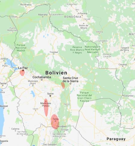 Die Weinanbaugebiete in Bolivien sind wie oben in der Karte ersichtlich: