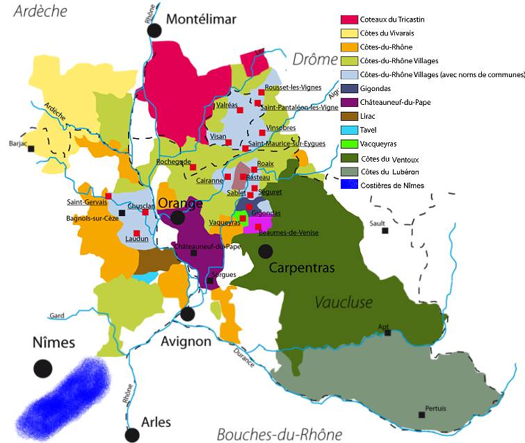 Außer der umfassenden und allgemeinen Regional-Appellation "Côtes du Rhône" wird auf mehreren Tausend Hektar auch die nächst höhere Klassifizierung "Côtes du Rhône Villages" angebaut, darüber hinaus gibt es im Süden auch fünf Lagen, wo "Cru"-Appellationen zu finden sind, darunter so bekannte Namen wie Châteauneuf-du-Pape, Gigondas und Vacqueyras.