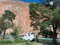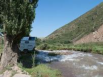 Nach einer kurzen Stadtbesichtigung bei 35°C geht es hoch in die Berge ins Almedin Tal und am nächsten Morgen in den Nationalpark Ala Artscha. Hier ist es angenehm kühl, und vor fantastischen Gebirgspanoramen finden wir auf 1.600 m Höhe einen schönen Stellplatz im Halbschatten, auf dem wir mit dem Heck direkt über einem Gebirgsbach stehen.