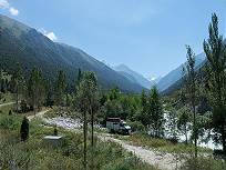 Auch von hier müssen wir uns regelrecht losreißen, aber es geht ja jetzt zu dem "Höhepunkt" unserer Reise, vorbei am Barskoon Wasserfall zur Barskoon Hochebene. Bei der Fahrt durch das Traumtal sehen wir auf einmal im Rückspiegel einen vertrauten Land Rover, es ist der uns bereits bekannte Tim, der alleine unterwegs ist und noch weiter nach China will.