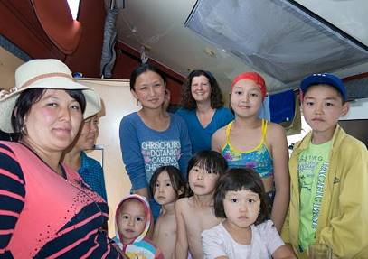 In einem kleinen Ort am Südufer befüllen wir am Dorfbrunnen nochmal unsere Wassertanks und finden dann eine Traumbucht in der Nähe von Kyzyl-Tuu. Hier relaxen wir ein paar Tage direkt am oder im leicht salzhaltigen Wasser und genießen das Traumwetter und den einmaligen Ausblick. Am dritten Tag hält ein paar Meter entfernt ein alter MB Doka, vorne steigen fünf Erwachsene aus und von der Ladefläche springen 12-14 Kinder. Während die Frauen einen großen langen Tisch ausladen und anfangen, fröhlich Gemüse zu putzen, gehen die Männer und die schon des Laufens fähigen Kinder schwimmen. Es duftet bereits gut, als ein 14jähriges Mädchen zu uns kommt, um uns zum Essen zu bitten. Sie spricht Deutsch und auch ihr zwölfjähriger Bruder möchte mit seinen Englischkenntnissen nicht hinten anstehen.