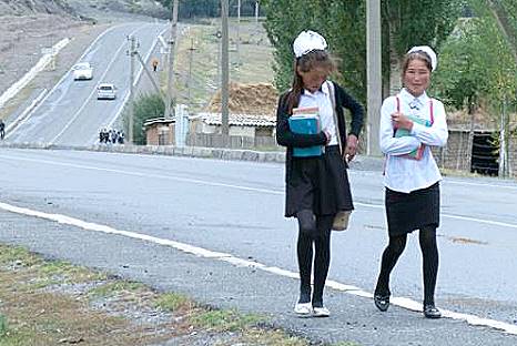 Am 01.09. ist Schulanfang und wir sehen viele mehr oder weniger motivierte Schulkinder, bevor wir über den 3.615 m hohen Taldik Ashuu klettern und uns dann ein schönen Standplatz in Sichtweite des Pik Lenin (7.134 m) suchen. Immer wieder wechselnde Ausblicke auf das traumhafte Bergpanorama sind mehr als eine Belohnung für die kurvige und steile Anfahrt. Auf der Straße geht es zu wie beim Almabtrieb - die Nomaden verlassen ihre Sommerweiden, treiben Schaf-, Kuh- und Pferdeherden ins Tal und transportieren die letzte Kohle sowie Futtermittel für den langen Winter bergab ...