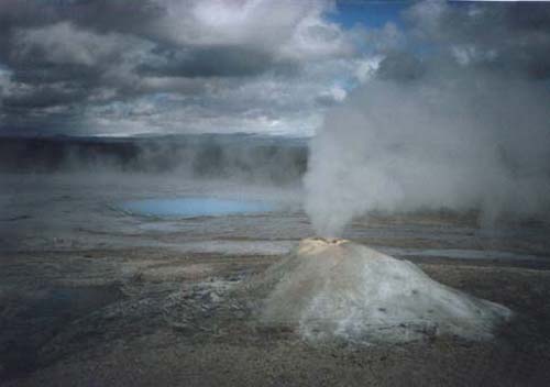Die ganze Nacht hat´s geregnetund am Morgen ist alles grau in grau. Wir frühstücken im Zelt, der Wind bläst zu stark. Zu allem Überfluß fängt auch noch unser Benzinkocher an zu spucken. Wir erfinden eine neue super schmeckende Müsli-Variante: Müsli, Skyr und Kakaogetränk (©Berger, 1997). Wir gehen nach Namaskarð, ca. 1h vom Zeltplatz in nördlicher Richtung, immer der Straße lang. Schon von weitem wabbern uns die Dampfwolken mit deftigem Schwefelwasserstoff-Geruch entgegen. Während vor 10 Jahren das ganze Gebiet frei zugänglich war, kanalisieren jetzt Absperrungen die Besucherströme und helfen so mit, daß die immer wieder vorkommenden Unfälle durch Verrennungen weniger werden. Betritt man die weißen Stellen rings um die Fumarolen, hat man eine gute Chance einzubrechen und sich die Wadl zu verbrennen. Neben den pfeifenden Schwefelstinkern sehen wir kochende und spritzende Schlammpfühle mit z.T. mehreren Meter großen Minikratern in denen es heftig blubbert und sprotzt. |